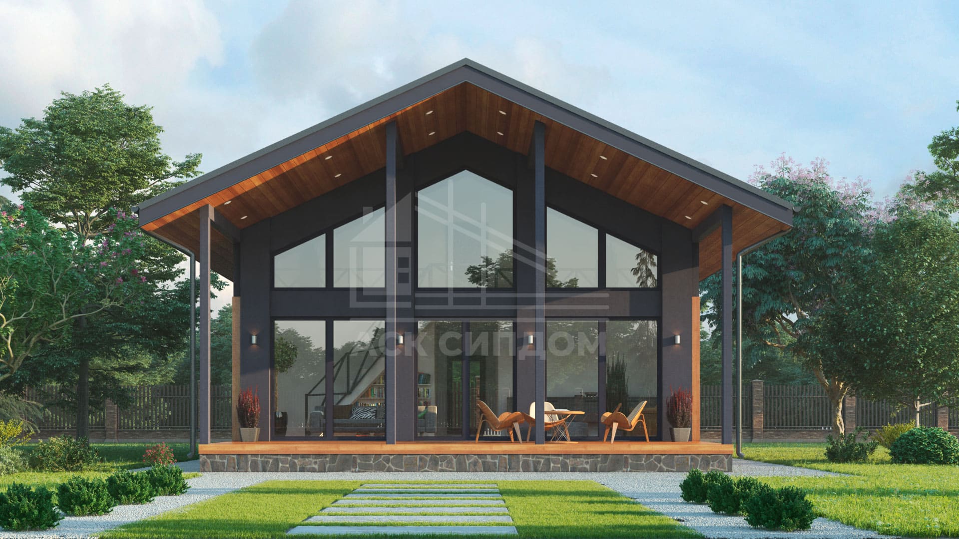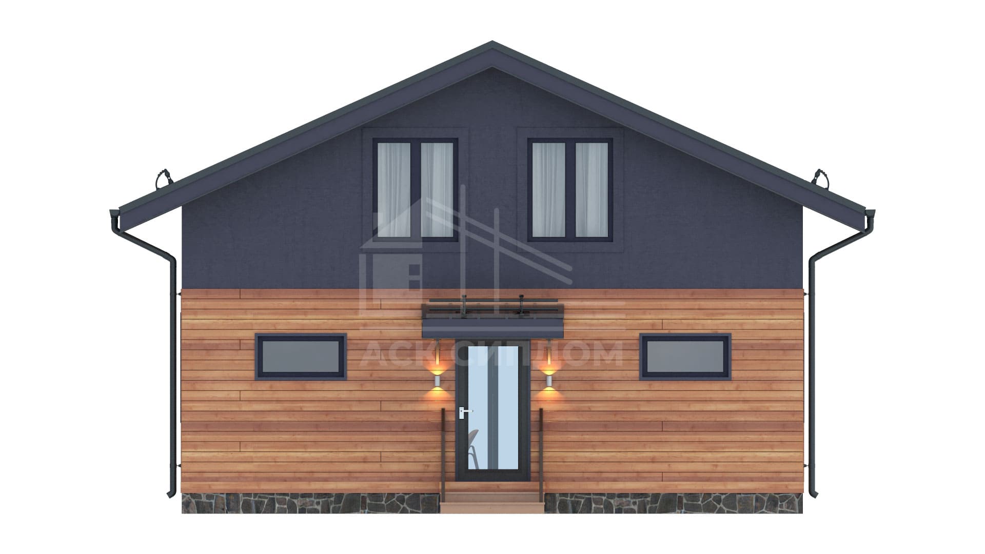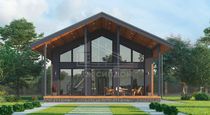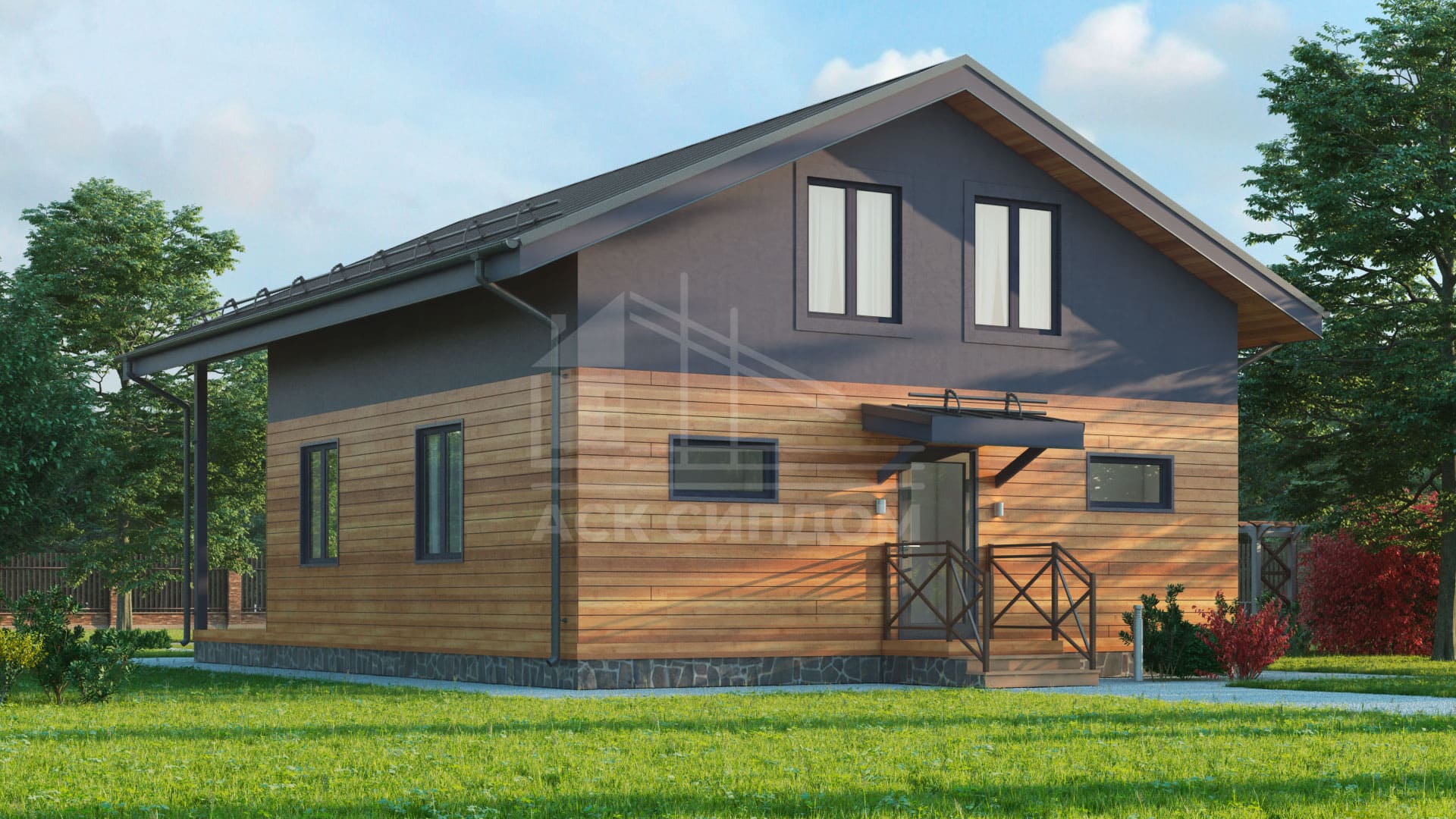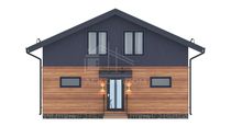 Проект дома в стиле фахверк с большой площадью фасадного остекления и вторым светом. Второй этаж мансардный.