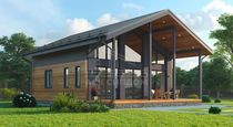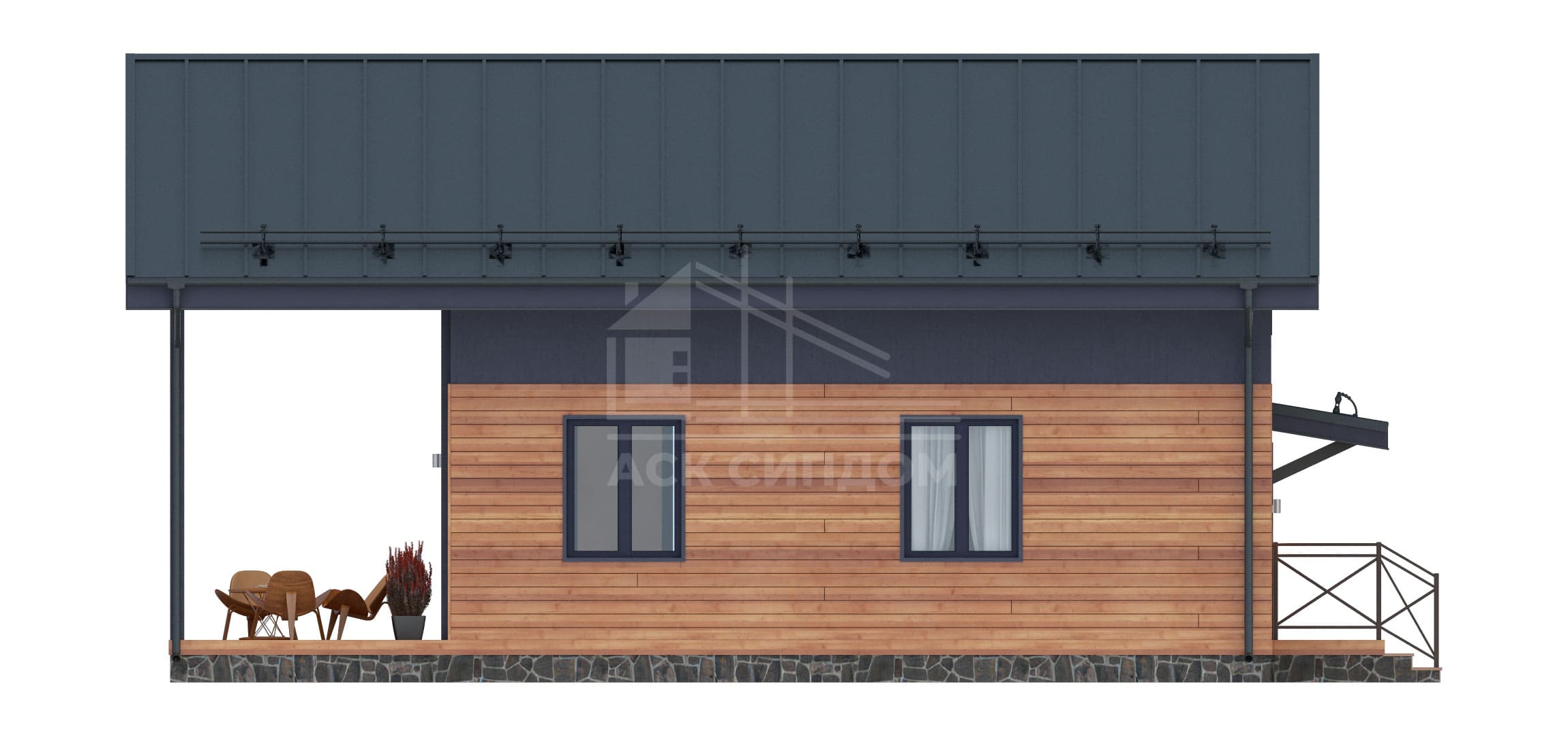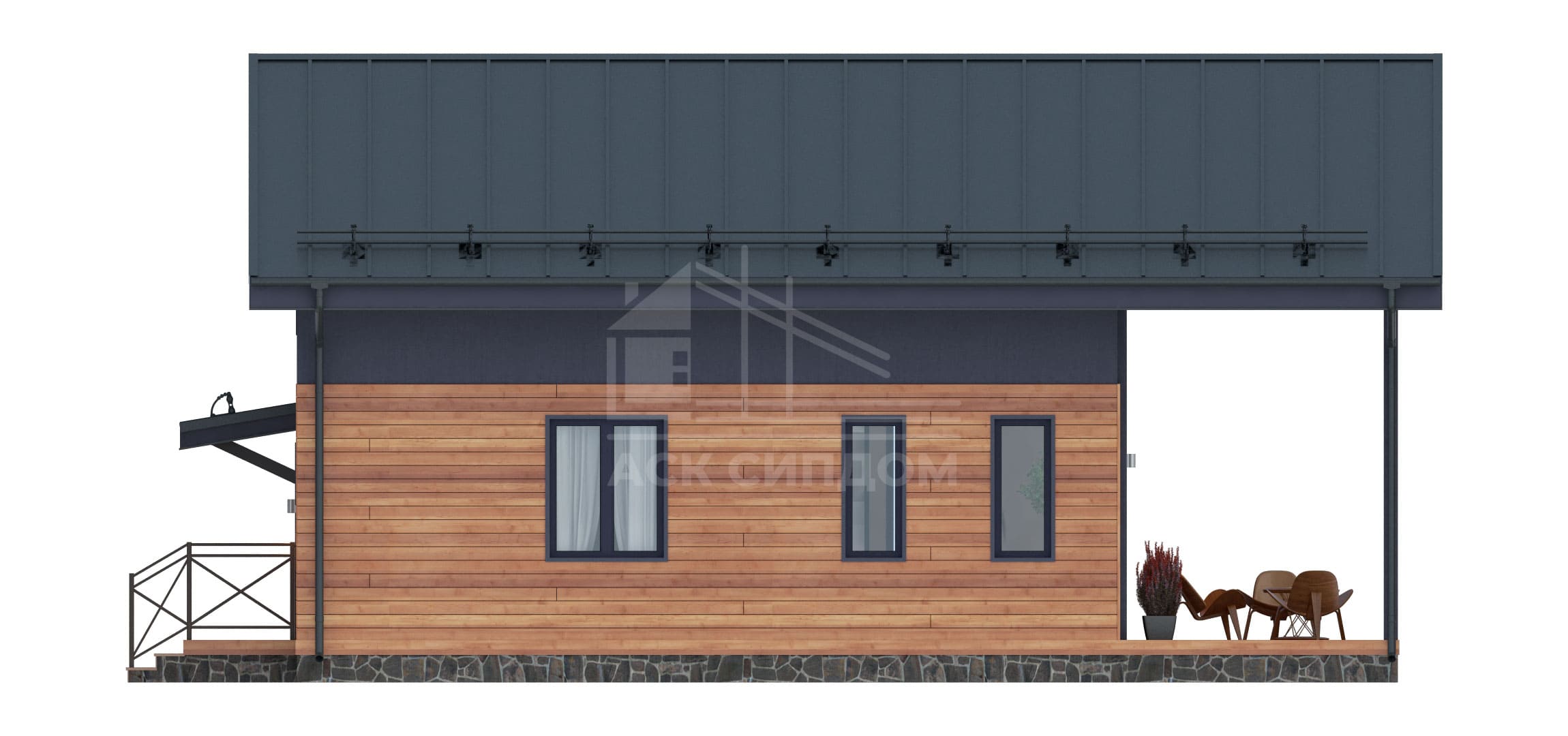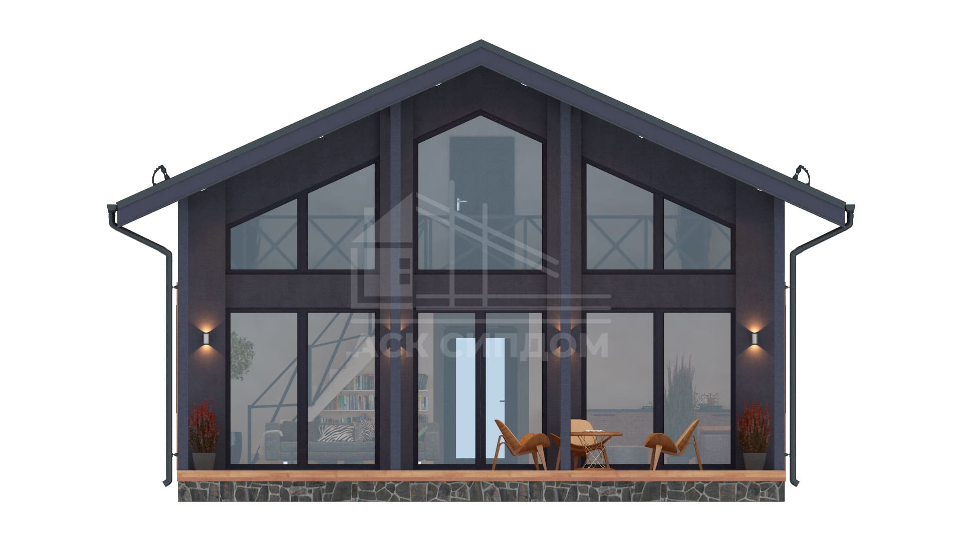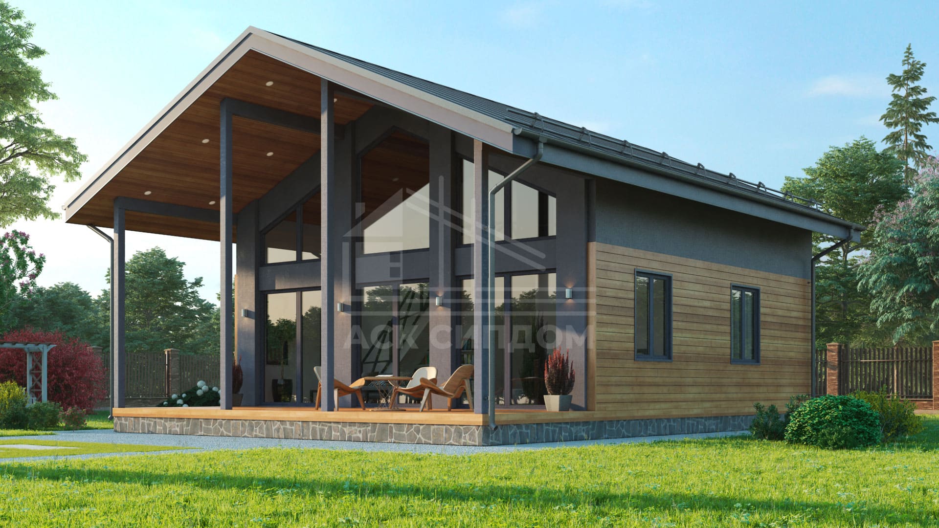 Проект дома в стиле фахверк с большой площадью фасадного остекления и вторым светом. Второй этаж мансардный.