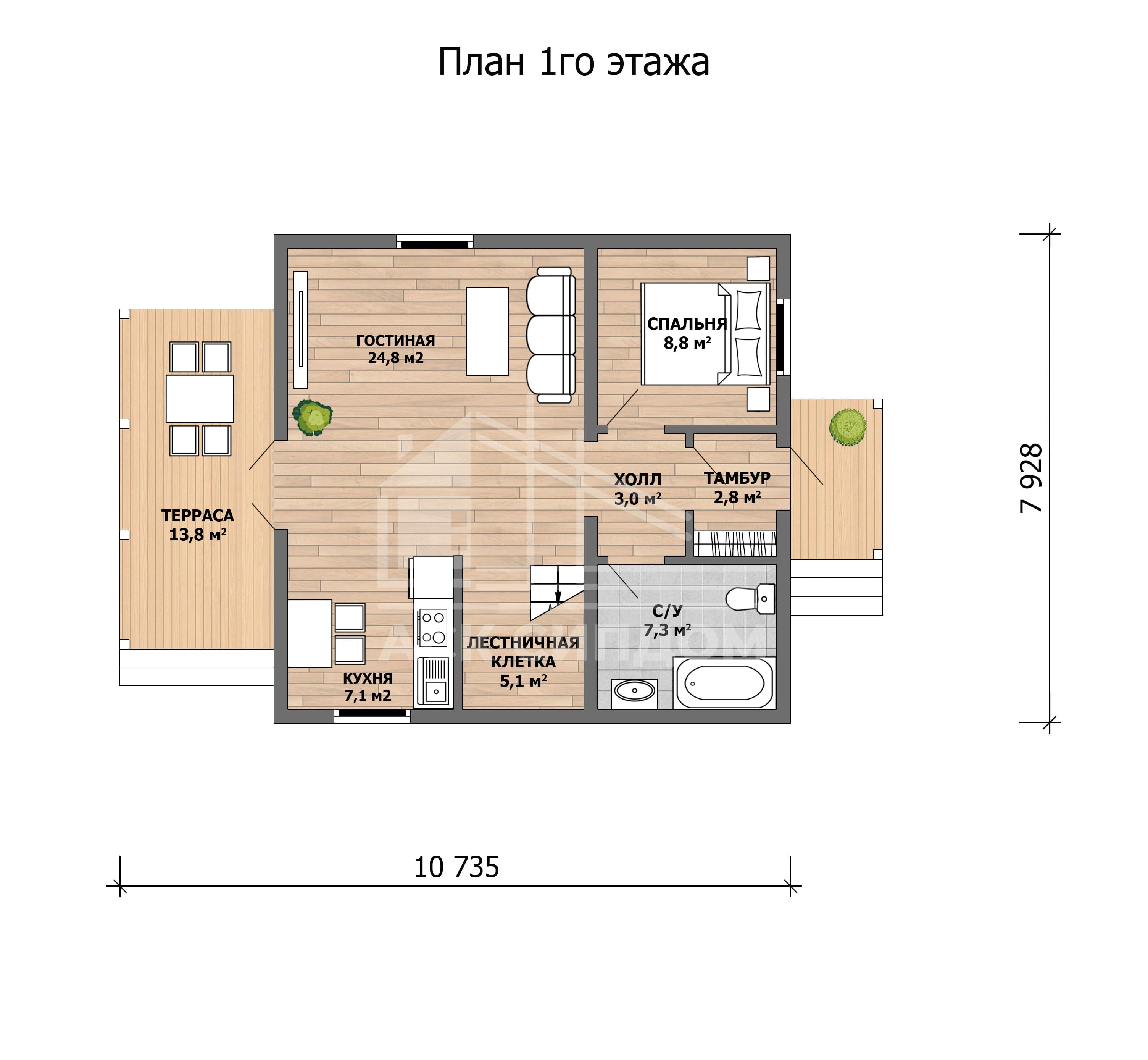 Полезная площадь дома — 113 м2, площадь террасы — 14 м2, высота потолков — 2,5 м.