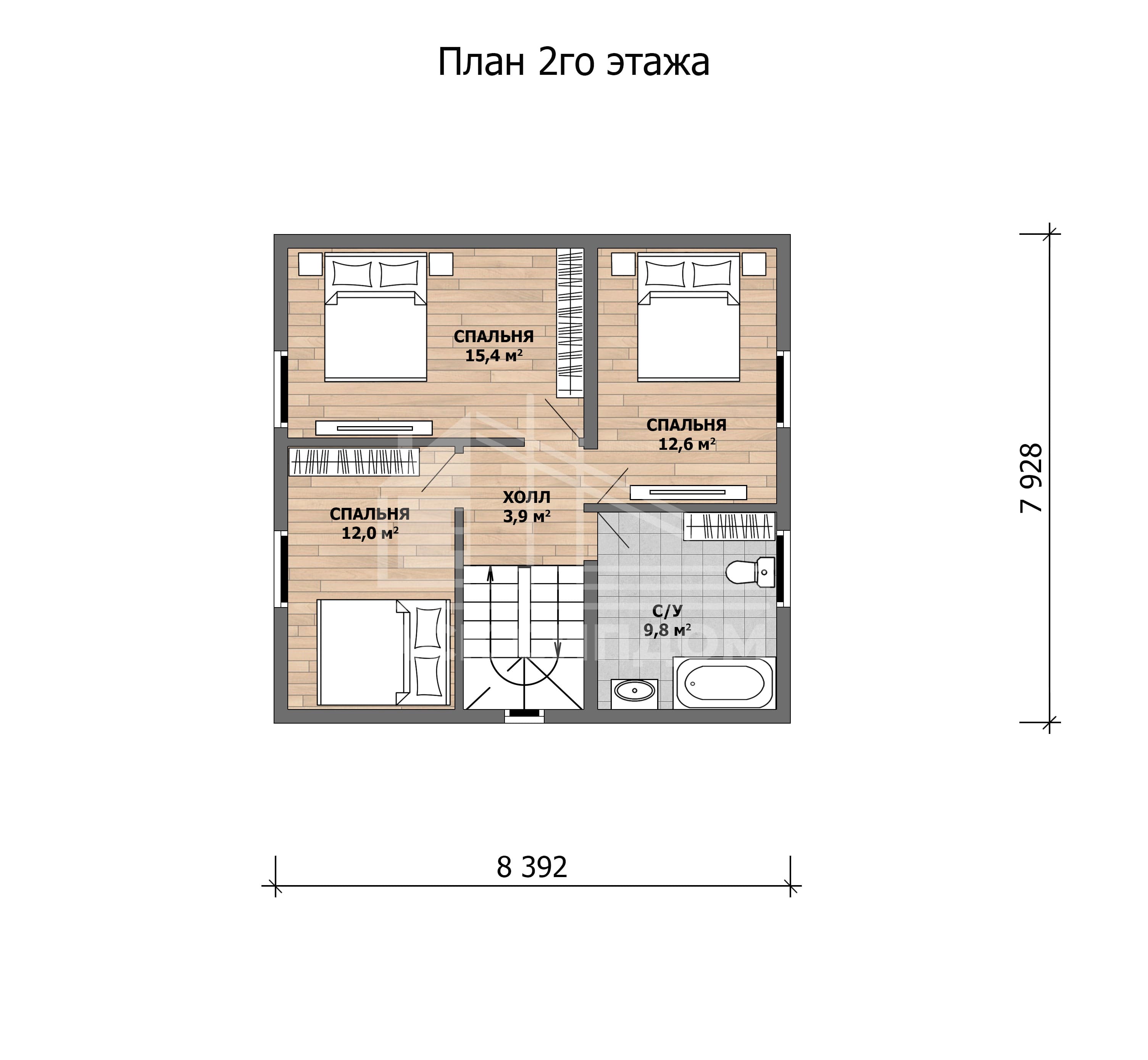 - три спальни — 12,0 м2, 12,6 м2, 15,4 м2