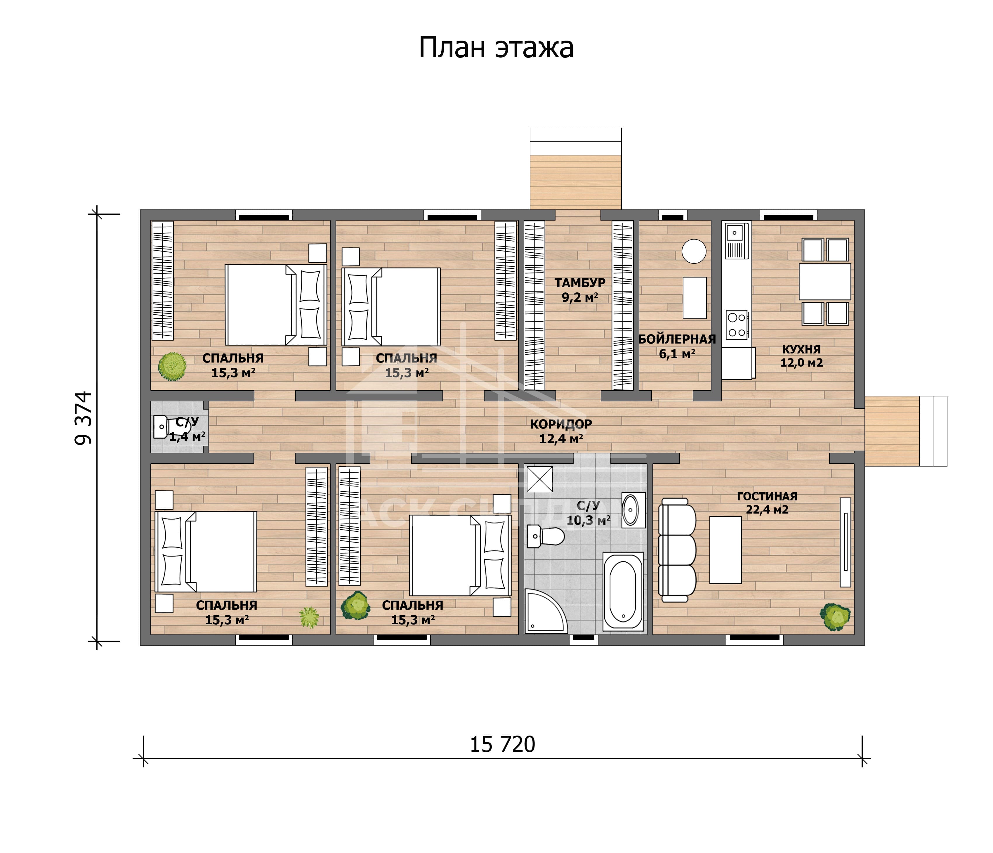 Дом для большой семьи с кухней-гостиной и четырьмя большими спальнями.