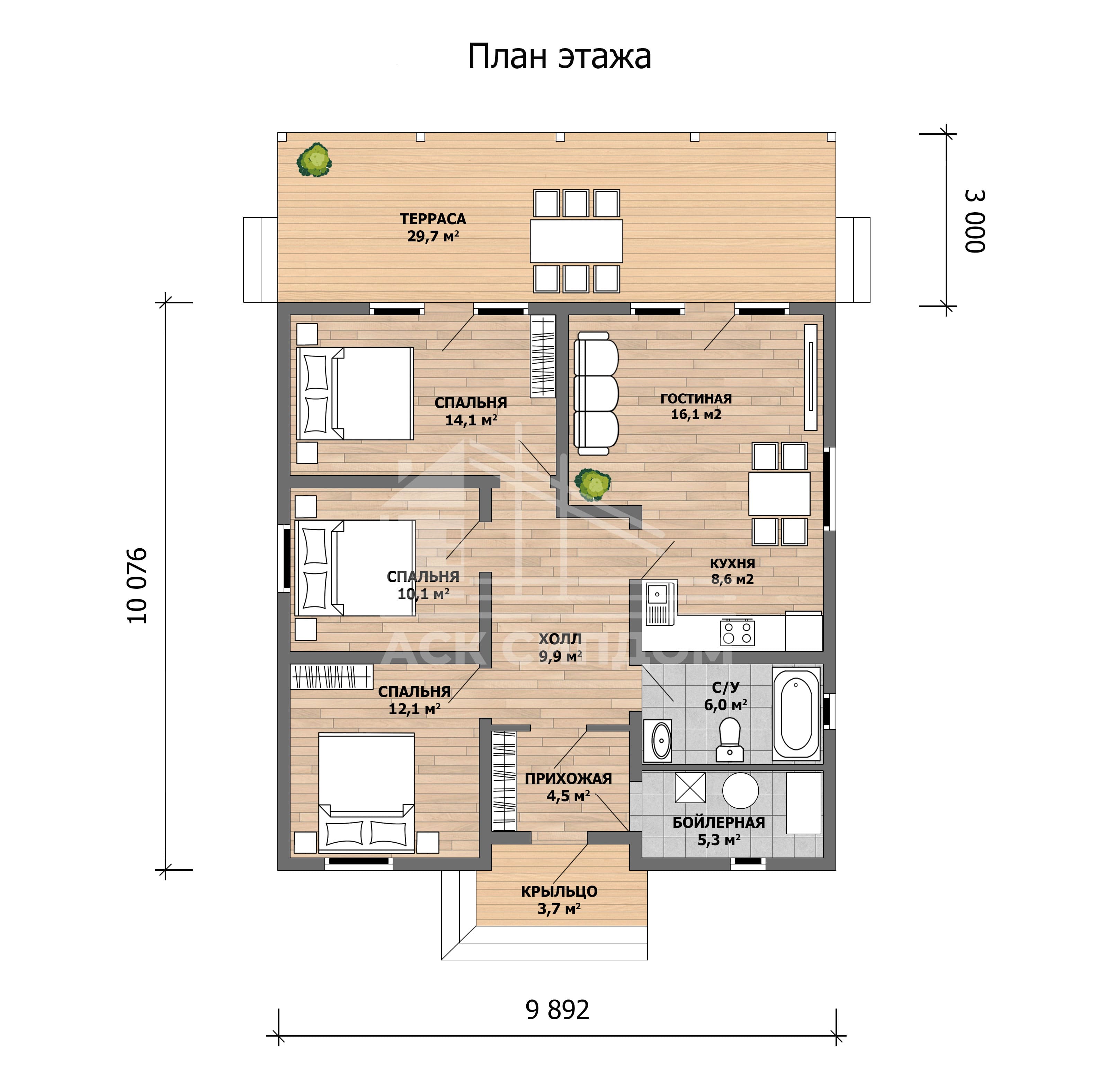 - три спальни — 14,1 м2, 10,1 м2, 12,1 м2