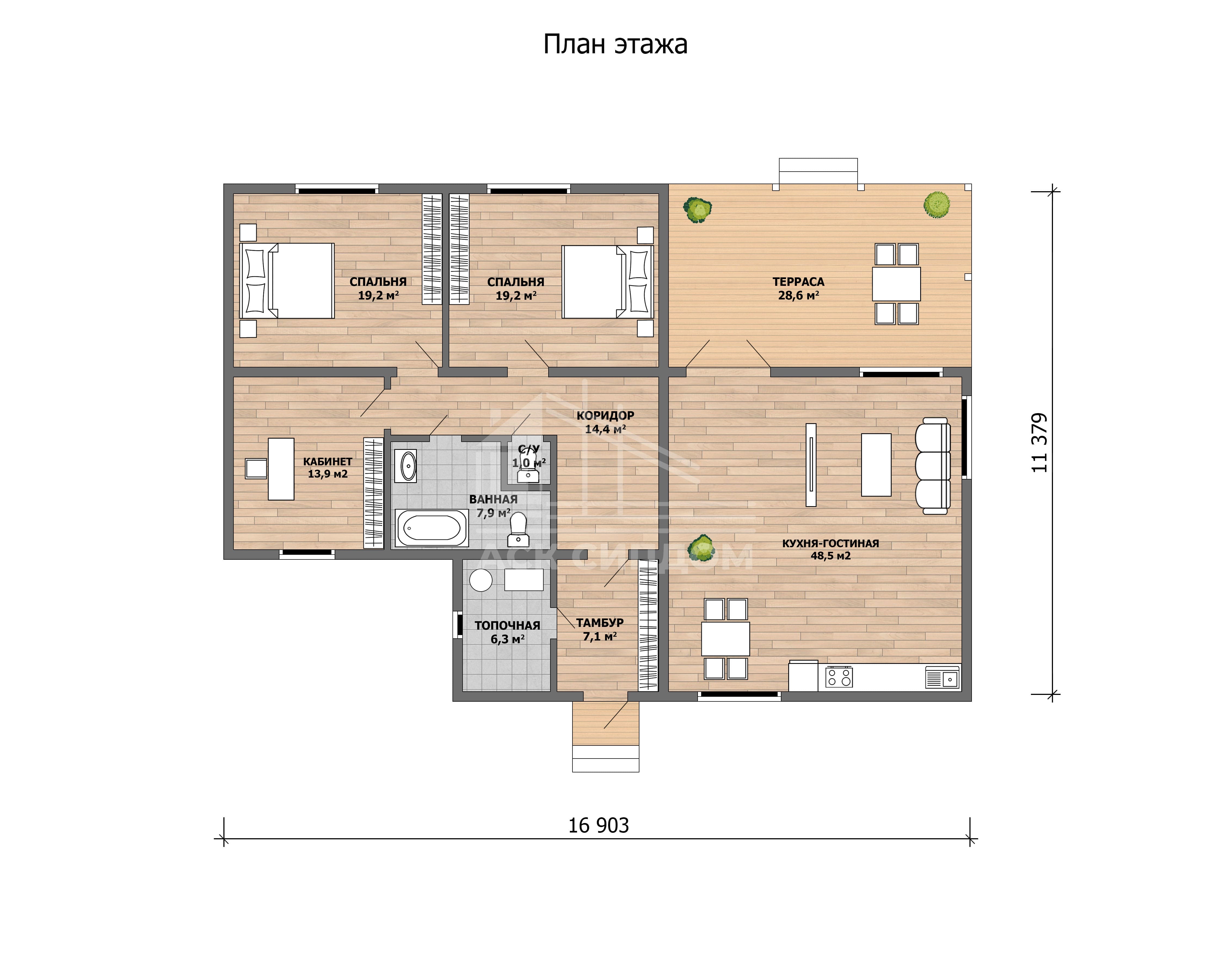 Проект интересен функциональной планировкой, наличием большой кухни-гостиной с высотой потолка 3 м и выходом на закрытую террасу 29 м2.